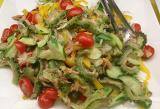 甘酢とツナの油のドレッシングで和えたゴーヤのサラダ。トマト、きゅうり、ツナの食材がゴーヤの苦味をおさえます。