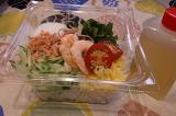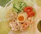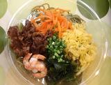 麦ご飯にもみのりをちらし、山芋とろろ、わかめ、鮭フレーク等をトッピング!! 塩味をつけた濃い目の冷たいだしをかけてさらさらと