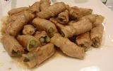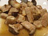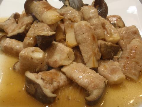 しゃぶしゃぶ用の豚肩ロース肉でエリンギを巻き、味つけは黒酢風味のあんかけ