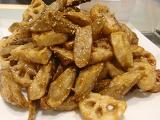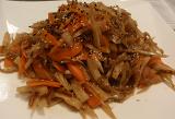 3Lサイズの太いごぼうをごま油で充分にいため火を通します。ささがきから調理までの時間が短いためおいしさが違います。 100gで4gの食物繊維が取れます。