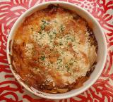 板状のパスタ、ミートソース、ホワイトソース、ひき肉ソテーを順に重ねて焼いたものがラザニア。手間がかかりますね。
