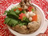 あごだしをベースにしたつゆに、手作り鶏だんご、白菜、博多春菊、福岡県産きのこからのうまみがプラスされ、一層おいしくなったお鍋です。 電子レンジでの簡単調理です。