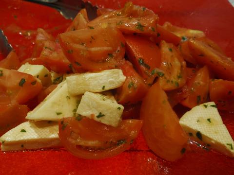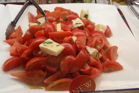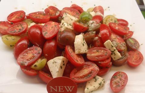 普通のトマトの4倍のリコピンと3倍のグルタミン酸を含んでいるカクテルトマトと宮崎県産のイエローアイコを組み合わせたサラダ