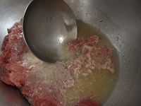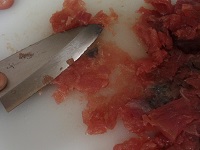かつおは包丁で細かくたたき更に包丁の腹を使ってペースト状にする。これをボウルに入れる。  |