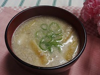 なべに水カップ4 1/2を入れ火にかけ沸騰したらみそを溶き入れる。 かたくり粉大さじ1を同量の水で溶き流し入れとろみをつける。  |
