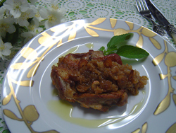 鶏肉は皮全面にフォークでつきながら穴をあけ、両面に塩、こしょう各少々をふる。バターでにんにくを炒め、鶏肉を皮目から入れ両面をカリッと焼き火を通す。 |